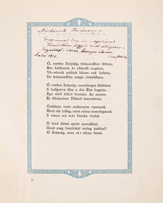 Az Art & Antik tehát idén nemcsak a képzőművészet kedvelőinek kínál élményt, hanem az irodalomtörténet iránt érdeklődőknek is: egy száz évvel ezelőtti karácsonyi üzenet révén megelevenedik a fiatal költő alakja, s a kéziratos sorok új, személyes fénytörésbe helyezik a Szépség koldusa megszületésének korszakát.